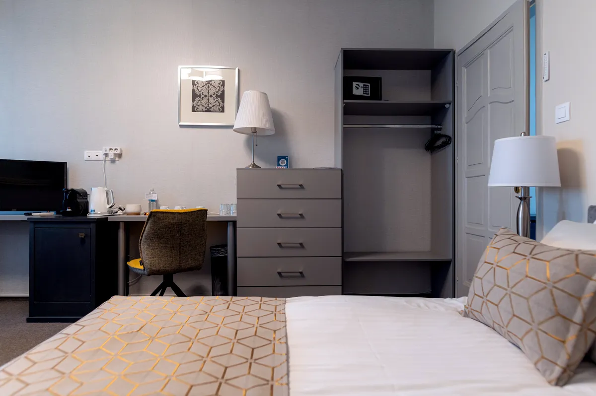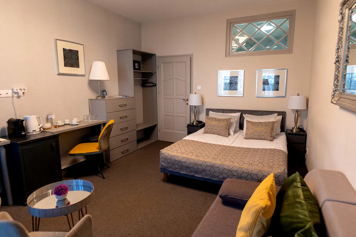 A lakosztályban két különálló franciaágyas hálószoba található. A nagyobbik szobában egy kanapé is helyet kapott, ahová el lehet vonulni olvasgatni, beszélgetni, TV-t nézni. A szobából egy kis erkély nyílik az utcára. Vendégeink a szobában elhelyezett kapszulás kávéfőzőn készíthetnek friss zamatos kávét maguknak. A fürdőszoba elegáns színvilága és berendezése minden igényt kielégít.