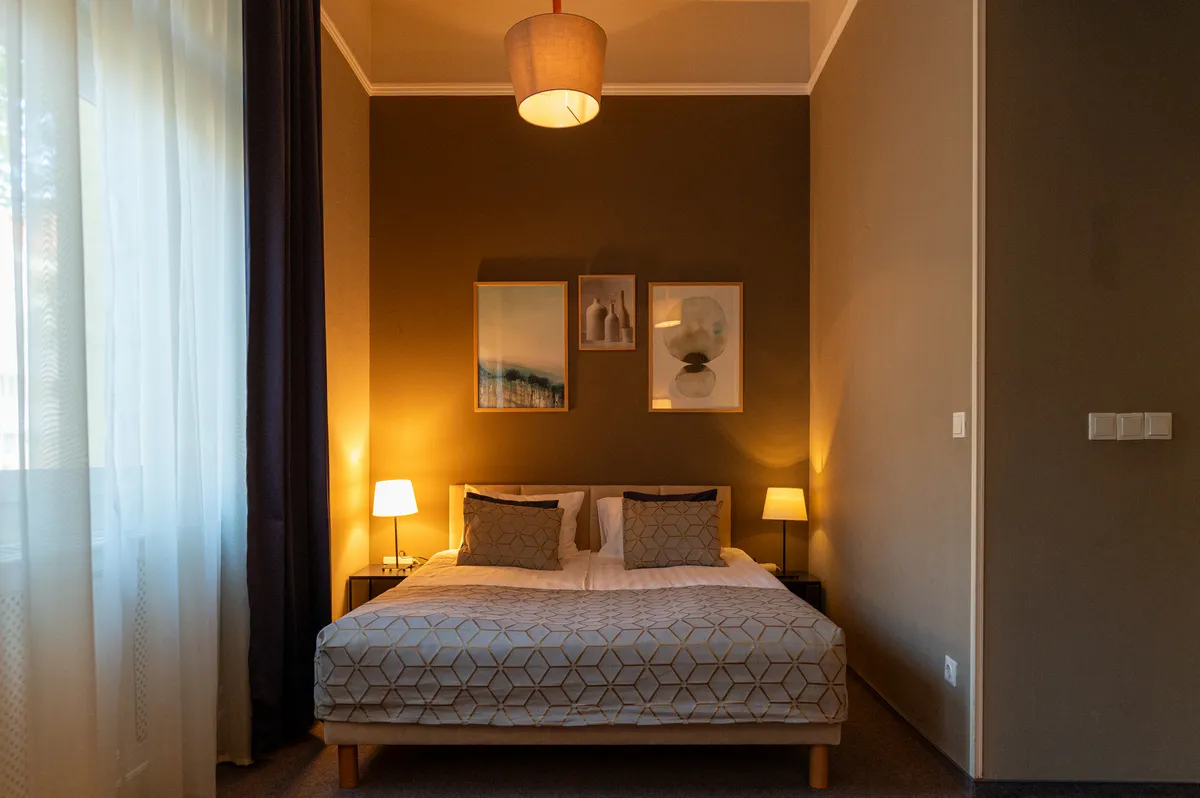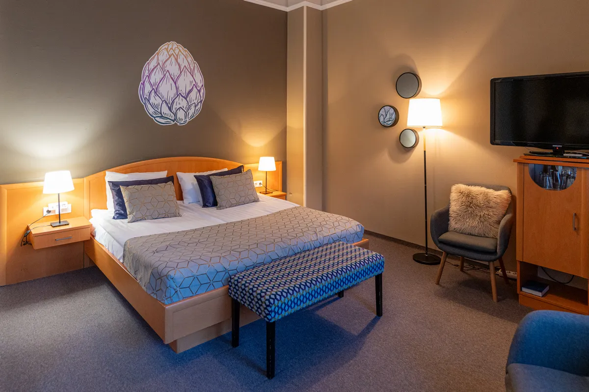 Tágas hálószobai résszel, két franciaággyal és kellemes társalgóval rendelkező egy légterű szoba. Ideális hosszabb időre érkező üzleti úton lévő vendég, párok, vagy családok részére.